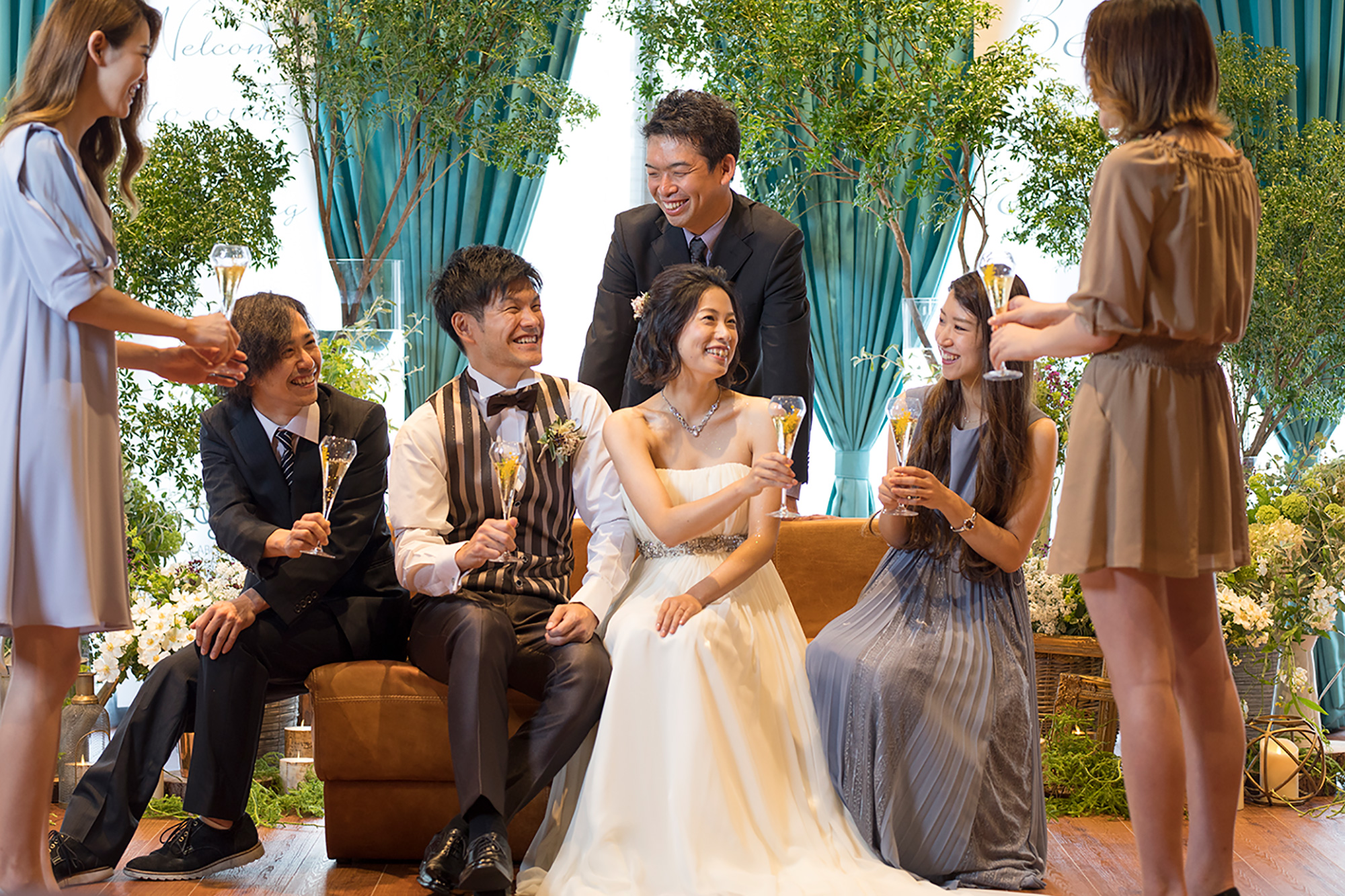 チャペル2Fのカフェスペースにて、おくつろぎいただけます。長居が難しいゲストにも、気軽に参加していただきやすく、Short party(Max1時間イメージ)と挙式がセットになったプランです。