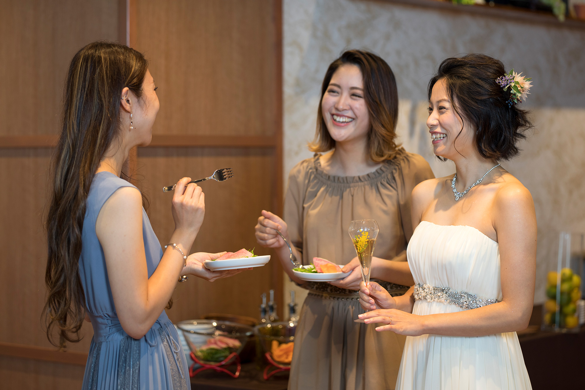 新郎新婦はタキシード&ドレスを引き続き着用して参加できるプランなので、パーティーでも存分にゲストと写真撮影や歓談をお楽しみください。